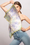 Cada pañuelo es una pieza única, ilustrada y confeccionada artesanalmente, con una textura ligera y un brillo sutil que acompaña cualquier look. Versátil y atemporal, puede llevarse al cuello, en el cabello o como top, transformándose según la ocasión.
